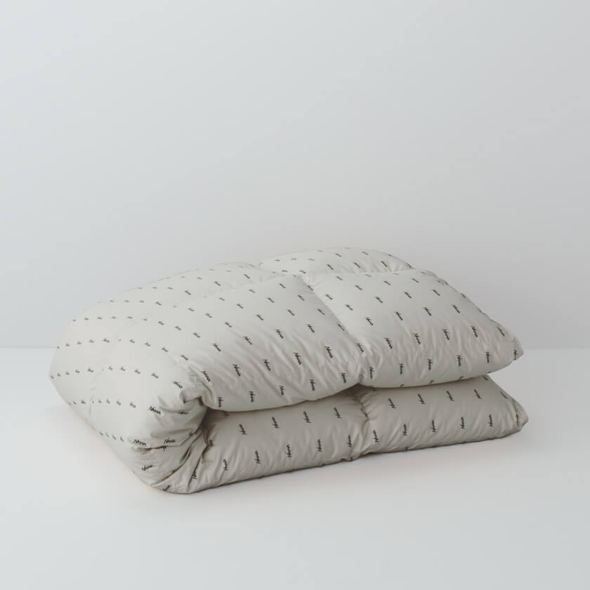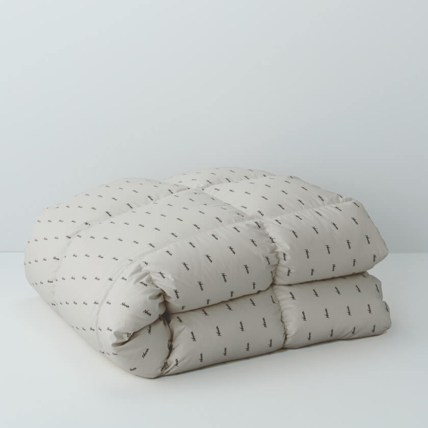 仕立直されたアップサイクル布団は、NANGAのロゴプリントが入った生地で生まれ変わります。しなやかなコットンサテン生地で、シーツとの相性も◎。